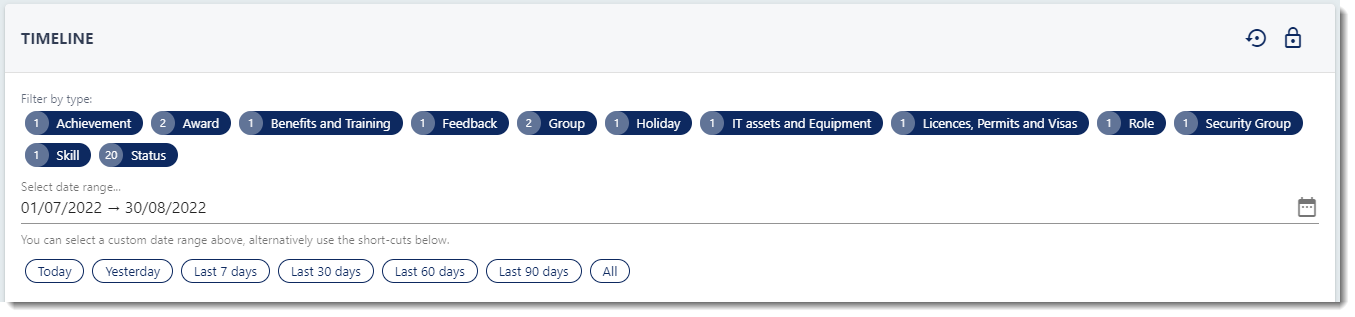 We're now showing all the events that are associated to an employee and if you've got someone that has been with you for a while, their existing timeline will start to grow with all the things happening throughout their lifecycle with you. And, so you don't spend time scrolling to find a set of events that you need, we've introduced filtering chips for the type of event that has been created as well as a set of pre-defined date ranges and a custom date search.